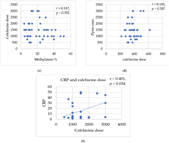 A significant positive correlation was detected between ESR and SAA levels (r = 0.647 and p-value = 0.002 **), Figure 5a, and between ESR and CRP levels (r = 0.618, p = 0.001 **), Figure 5b. Furthermore, a significant correlation was detected between colchicine dose (1470.93 mg/day ± 692.7) and CRP level (14.13 mg/L ± 17.4) (r = −0.401, p = 0.034 *), Figure 5e, while a non-significant correlation was detected between colchicine dose (1470.93 mg/day ± 692.7) and the MEFV exon 2 methylation% (18.95% ± 11.6) (r = −0.137, p = 0.382) and pyrin level (r = 0.135, p = 0.387) among the patients, Figure 5.