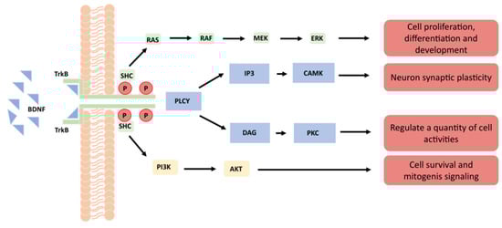 BDNF acts by binding with two receptor systems—one being the high-affinity TrkB (tyrosine kinase B, also referred to as NTRK2) and the other being the low-affinity receptor p75 (a typical nonspecific receptor for all neurotrophins, also referred to as NGFR) [1] (Figure 1). After BDNF binds to TrkB, it activates the intracellular region, which leads to the enhancement of TrkB’s self-phosphorylation, thus activating RAS–MAPK and other pathways. The RAS–MAPK pathway leads to cell proliferation and differentiation, while the PLCγ pathway induces activation of inositol triphosphate (IP3), which further increases intracellular calcium release and ultimately leads to enhancement of the synaptic plasticity of neurons [2] (Figure 1). In addition, the latter pathway also allows survival of diacylglycerol (DAG) and regulates transcription factors, while the PI3K/Akt pathway plays an important role in cell signaling during mitosis. At the same time, this pathway can enhance hypoxia-inducible factor-1 (H1F1a) and increase the expression of TrkB. This regenerative feedback loop further enhances the positive effect of BDNF on cell division [3] (Figure 1).