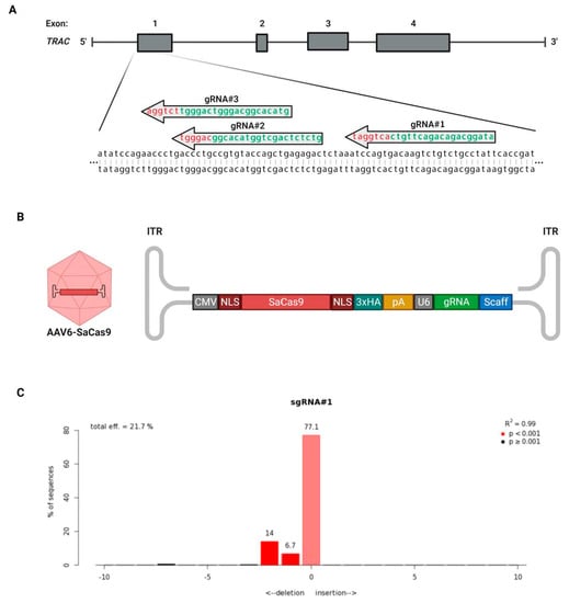 The following guide RNAs targeting the TRAC locus were evaluated: (1) ataggcagacagacttgtca; (2) gtctctcagctggtacacgg; and (3) tacacggcagggtcagggtt. Each guide RNA (gRNA) was synthesized as 2 complementary DNA strands with BsaI overhangs at the 5′ end. The oligo DNAs were annealed and inserted into the plasmid pX601-AAV-CMV::NLS-SaCas9-NLS-3xHA-bGHpA;U6::BsaI-sgRNA (a gift from Feng Zhang, Addgene plasmid #61591; http://n2t.net/addgene:61591, accessed on 7 April 2021; RRID:Addgene_61591), which encodes for the SaCas9, via restriction cloning at the BsaI site [49]. The three plasmids containing each of the three gRNAs were named pX601-AAV-SaCas9-TRAC#1, pX601-AAV- SaCas9-TRAC#2, and pX601-AAV-SaCas9-TRAC#3, respectively. The plasmid containing the DNA template for homology-directed repair was designed to encode for the gene of the anti-CD19 chimeric antigen receptor (FMC63-28Z receptor protein) and an EGFP marker based on the plasmid pSLCAR-CD19-BBz [50], flanked by a 150-bp homology arm upstream of the template (left homology arm, LHA) and a 500-bp homology arm downstream of the template (right homology arm, LHA). The ITRs flank the entire construction for packaging into an AAV vector. The construct was synthesized by BioBasic (Markham, ON, Canada) and cloned into a pUC57 vector. The final plasmid was named pUC57_AAV_anti-CD19_CAR_HDR.