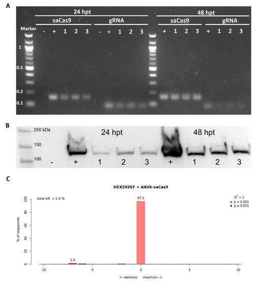 Evaluation of AAV6 delivery of CRISPR/Cas9 system in HEK293SF cells. Samples were collected 24 or 48 h post-transduction (hpt). Negative (−) control is a sample from non-transduced cells; positive (+) control is a sample from cells transfected with a plasmid encoding for SaCas9 and gRNA (pX601-AAV-SaCas9-TRAC#1); 1–3 indicate the replicates. (A) Expression of SaCas9 messenger RNA and gRNA detected via agarose gel electrophoresis after RT-PCR. Marker in kb. (B) Detection of SaCas9 protein by Western blot. (C) Assessment of genome editing by sequence trace decomposition. Different bar colours indicate different p-values: bright red, p < 0.001; black, p ≥ 0.001.