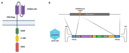 - MacLeod, D.T.; Antony, J.; Martin, A.J.; Moser, R.J.; Hekele, A.; Wetzel, K.J.; Brown, A.E.; Triggiano, M.A.; Hux, J.A.; Pham, C.D.; et al. Integration of a CD19 CAR into the TCR Alpha Chain Locus Streamlines Production of Allogeneic Gene-Edited CAR T Cells. Mol. Ther. 2017, 25, 949–961. [Google Scholar] [CrossRef]