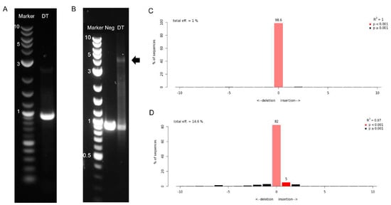 Insertion of anti-CD19 CAR into the TRAC locus via dual AAV6 transduction. (A) Detection of transgene insertion is not detected in medium-MOI transduction 48 h post-transduction. (B) Detection of transgene insertion via PCR amplification of the TRAC locus 96 h post-high-MOI transduction. DNA marker in kilobases (kb); Neg, non-transduced Jurkat cells; DT, dual transduced Jurkat cells. Black arrow indicates amplicon with the expected transgene size (~4.3 kb). (C) Assessment of genome editing by sequence trace decomposition of medium-MOI transduction. (D) Assessment of genome editing by sequence trace decomposition of high-MOI transduction. Different bar colours indicate different p-values: bright red, p < 0.001; black, p ≥ 0.001.