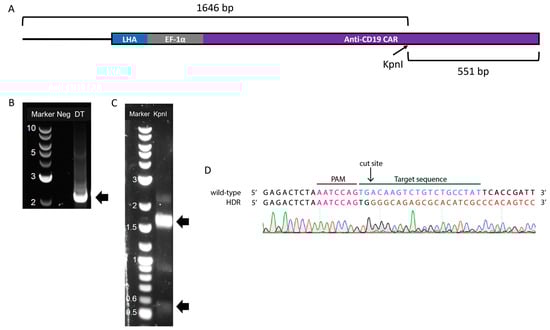 To further confirm the insertion of the transgene into the specific CRISPR/Cas9 cut site, the amplified product from the TRAC-flanking PCR was purified and used as the template for a second PCR (“nested”). A nested PCR was done using the same forward primer flanking the TRAC locus and a reverse primer that annealed inside the transgene, more specifically in the CAR region, resulting in the product shown in Figure 5A. As expected, a band of 2.2 kb was obtained (Figure 5B). This band was then extracted and digested with KpnI, generating approximately 550- and 1650-bp (Figure 5C) fragments corresponding to the expected digested DNA. The 2.2-kb band from the undigested fragment was also visible, as well as a 0.9-kb band, the same size as the unmodified TRAC locus also visible in Figure 4B. The material from the 2.2-kb band was also sequenced, confirming the insertion of the transgene template at the TRAC locus (Figure 5D).
