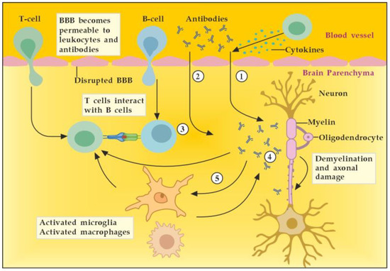 Potential mechanisms of antibody pathogenicity in multiple sclerosis. Adapted from [7] and modified. [activated T cells ① and circulating antibodies ② damage BBB and increase its permeability; activated B cells ③ add to the antibodies production in brain parenchyma; antibodies induce direct damage ④ or promote demyelination indirectly via activation of microglia and macrophages ⑤].