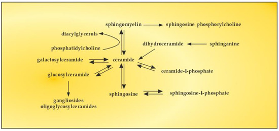 The bioactive lipid, S1P, is generated by phosphorylation of sphingosine, catalyzed by two isoforms of sphingosine kinase (SK1 and SK2). S1P can also be reversibly dephosphorylated by S1P phosphatase to produce sphingosine, the levels of which are generally controlled by flux through de novo ceramide synthesis and sphingosine catabolic pathways [126]. There are numerous studies on the sphingomyelin (SM)–S1P pathway in order to reveal whether SM serves as a major source of S1P through the activities of sphingolipid metabolizing enzymes [127]. The obtained results showed upregulation of certain sphingolipid catabolizing enzymes, implying that SM could serve as a possible source of S1P (Figure 6).