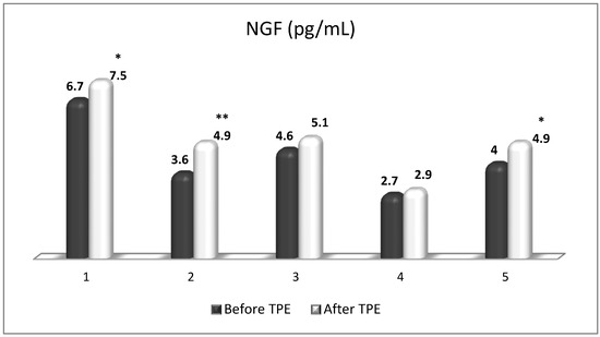 Changes in the level of NGF before and after a TPE procedure in patients (1, 2, 3, 4, 5) with acute exacerbations of relapsing–remitting MS (* p < 0.05; ** p < 0.01).