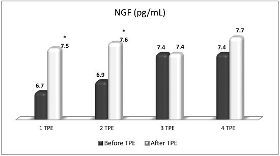 Changes in the level of NGF before and after the course of TPE procedures (1, 2, 3, 4) in a patient with acute exacerbations of relapsing–remitting MS (* p < 0.05).