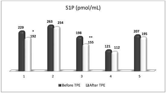 Changes in the level of S1P before and after a TPE procedure in patients (1, 2, 3, 4, 5) with acute exacerbations of relapsing–remitting MS (* p < 0.05; ** p < 0.01).