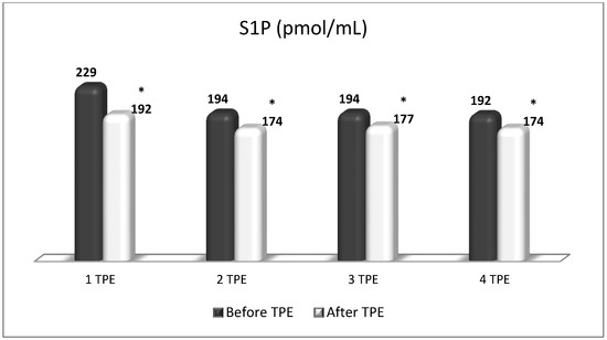 Changes in the level of S1P before and after the course of TPE procedures (1, 2, 3, 4) in a patient with acute exacerbations of relapsing–remitting MS (* p < 0.05).