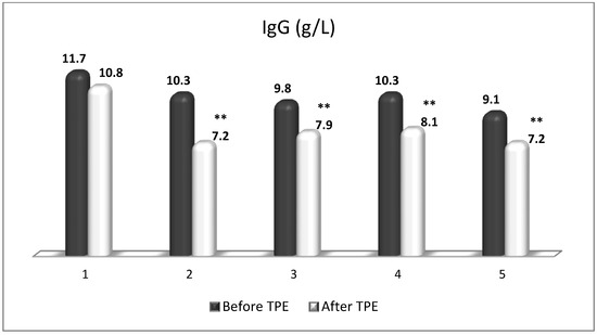Changes in the level of IgG before and after a TPE procedure in patients (1, 2, 3, 4, 5) with acute exacerbations of relapsing–remitting MS (** p < 0.01).