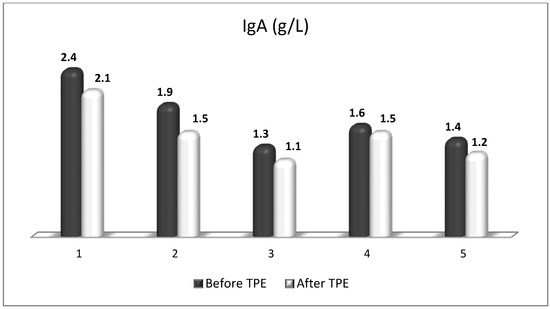 Changes in the level of IgA before and after a TPE procedure in patients (1, 2, 3, 4, 5) with acute exacerbations of relapsing–remitting MS (p > 0.05, there is a trend towards reduction).