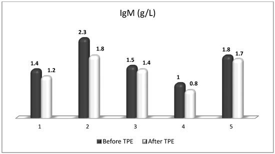 Changes in the level of IgM before and after a TPE procedure in patients (1, 2, 3, 4, 5) with acute exacerbations of relapsing–remitting MS (p > 0.05, there is a trend towards reduction).
