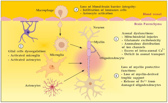 Astrocytes may play a role in inhibiting remyelination and axonal regeneration through reactive astrogliosis, glial scar formation, and the secretion of inhibitory molecules which suppress axonal growth [42]. TNF-α-mediated glutamate release from astrocytes leads to excitotoxicity, causing axonal damage. The ferrous iron (Fe2+) released from the myelin is oxidized to produce ROS leading to a major oxidative burst, causing mitochondrial dysfunction, mitochondrial DNA damage, energy failure, and axonal loss [18].