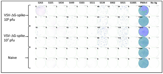 Testing immunodominance of epitopes from in-silico screen following VSV-ΔG-spike vaccination. C57BL/6 mice were vaccinated i.m. with either 106 pfu (n = 3) or 107 pfu (n = 3) VSV-ΔG-spike and sacrificed after seven days. The pool of splenocytes from each vaccinated group was used to evaluate IFNγ secreting T-cells by ELISpot assay in response to each peptide at a concentration of 2 μg/mL. Numbers at the upper left of each well represent the number of counted spots. In the positive control column (PMA + Ionomycin (PMA+I)), asterisk near the numbers represents wells in which some part was saturated; TNTC—too numerous to count.