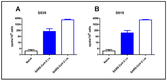 To demonstrate the applicability of our approach for epitope screening in the evaluation of the cellular response following SARS-CoV-2 infection, we used the two most dominant epitopes, namely S539 and S915, identified in our screen. For that purpose, we exposed K18-hACE2 mice to a low-dose (2 pfu) of SARS-CoV-2 virus by i.n. instillation, or immunized animals by i.m. injection (106 pfu). Although high, this immunization method was safe, causing only sporadic morbidity [18]. After seven days, the animals were sacrificed, and their spleens were removed and processed. Enumeration of T-cells, specific for the SARS-CoV-2 dominant epitopes, was performed by ELISpot assay using epitopes S539 or S915. Intranasal instillation, even at a very low dose of virus (2 pfu), induced a cellular response, depicted by hundreds of foci per million cells. Immunization by i.m. injection induced a 10-fold increase in cellular response (Figure 5). It should be noted that similar response values were obtained using the S539 epitope (Figure 5A) or the S915 epitope (Figure 5B).