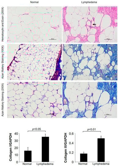 Representative hematoxylin and eosin (H&E) staining and Azan Mallory staining images of lymphedema patient adipose tissue and normal control adipose tissue are shown in Figure 1. In control adipose tissue, there was no fibrosis, and the adipocyte structure was preserved. In contrast, in adipose tissue samples taken from lymphedema patients, we identified fibrosis-forming collagen bundles with trapped adipocytes of various sizes. The connective tissue was most prominent around blood vessels, and infiltration of inflammatory cells was also observed in these areas. Furthermore, crown-like structures with inflammatory cells (Figure 1, black arrow) were observed in the adipose tissue of lymphedema patients. Azan Mallory staining showed that adipocytes in the control group were surrounded by light-blue, thin, fibrotic interstitial tissue. In contrast, adipose tissue from lymphedema patients stained dark blue, and dark staining was especially prominent in the cytoskeleton and around blood vessels. Moreover, expression of the collagen I and collagen III genes was significantly elevated in adipose tissue from patients with lymphedema (p < 0.05) (Figure 1, bar graph).