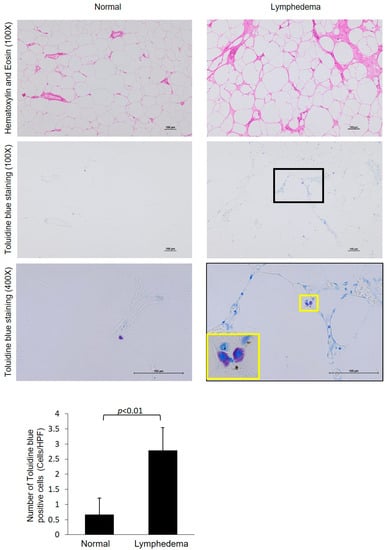 Representative images of toluidine blue staining and the calculated number of toluidine-positive cells in the normal adipose tissue and those from patients with lymphedema. The images below were higher-magnification images matched to the black frame. The cell indicated by the yellow frame was shown in the high-magnification image. The bar graph shows that the statistically significant increase in the amount of toluidine blue positivity was observed in lymphedema patients.