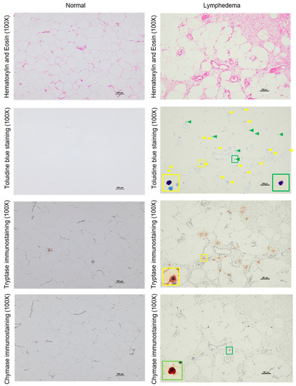 Representative images of H&E staining, toluidine blue staining, tryptase immunostaining and chymase immunostaining performed on serial sections of normal adipose tissue and the adipose tissue from patients with lymphedema are shown. For the sample with toluidine blue staining, yellow arrows indicate tryptase-positive MCs and green arrows indicate chymase-positive MCs. Cells indicated by yellow and green frames are shown in the high-magnification image.