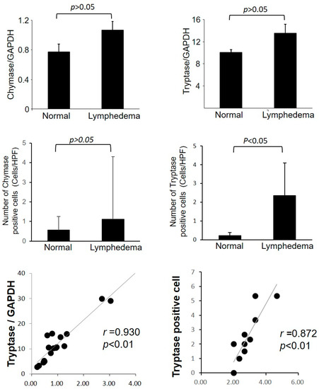 Figure 3 shows representative tryptase immunostaining images of lymphedema patient adipose tissue and normal control adipose tissue. The number of tryptase-positive cells and tryptase mRNA expression between the two groups is shown in Figure 4. The level of tryptase mRNA expression was generally higher in lymphedema patients. The expression of chymase mRNA also increased in lymphedema patients. As with the expression of MCs in control adipose tissue, the accumulation of tryptase-positive cells was low. However, numerous tryptase-positive cells accumulated in the adipose tissue of lymphedema patients. In comparison with control adipose tissue, the number of tryptase-positive cells was significantly higher in the adipose tissue of lymphedema patients (Figure 4). As indicated in the line graph, a strong positive correlation was found between the number of MCs and number of tryptase-positive cells. In contrast, although the number of chymase-positive cells was higher in lymphedema patients, the difference between lymphedema patient adipose tissue and normal control tissue was not significant (p > 0.05). With regard to the content of neutral proteases in secretory granules, two types of human MCs have been described. If MCs contain both tryptase and chymase in their secretory granules, these cells belong to the MCTC (tryptase-positive, chymase-positive) subtype, and if they contain only tryptase, they belong to the MCT (tryptase-positive, chymase-negative) subtype [19]. In this study, we observed a clear increase in the number of tryptase-positive cells compared to chymase-positive cells, indicating that the increase in the number of MCs in the adipose tissue of lymphedema patients may have been due to an increase in MCT-type MCs.