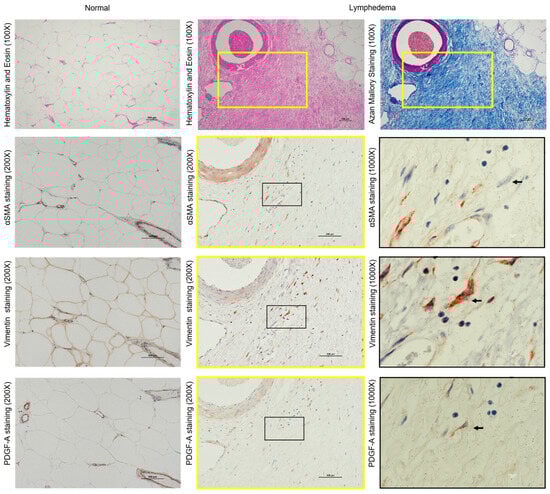Representative α-SMA, vimentin, and PDGF-A immunostaining of serial cross-sections of normal adipose tissue and the adipose tissue from patients with lymphedema. These loci were matched to the yellow frames of H&E and Azan Mallory-stained sections shown in the upper column. The immunostained images surrounded by yellow frames are magnified 200×, and the black frames are magnified 1000×.