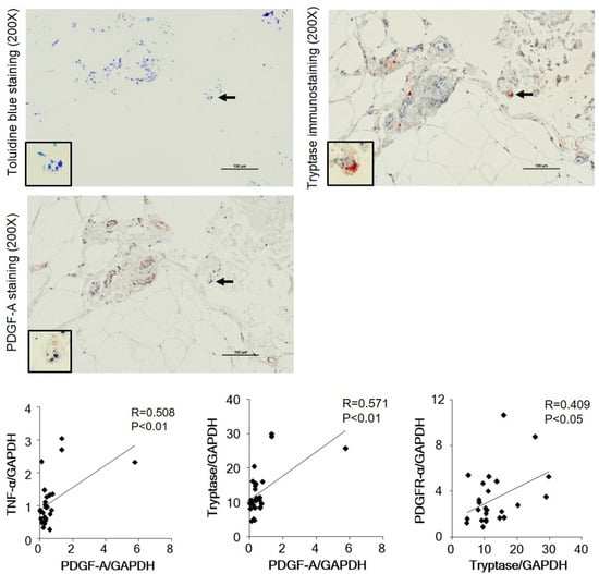 Representative toluidine blue, tryptase, and PDGF-A immunostaining of the serial sections of adipose tissue of lymphedema patients. The cell indicated by a black arrow is shown in high-power views. Mast cells identified via toluidine blue staining were located in the same position as the cells identified via tryptase staining, and some of the granules of the mast cells from the same site underwent PDGF-A immunostaining. Line graphs show the correlations between the gene expression of TNF-α and PDGF-A, tryptase and PDGF-A, as well as PDGFR-α and tryptase.