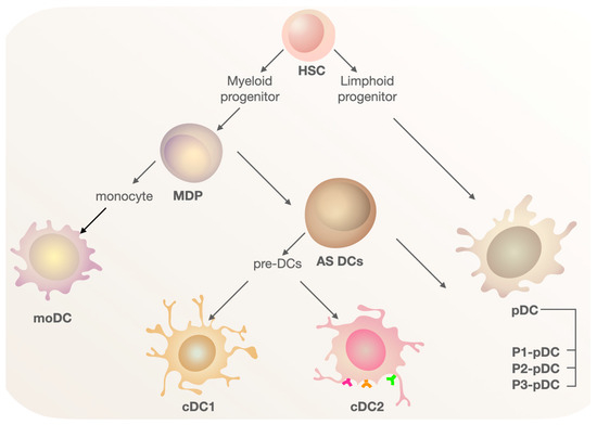 The scheme of the ontogenesis of DC populations. Myeloid and lymphoid precursors develop from hematopoietic stem cells. From the myeloid precursor, the macrophage DC progenitor (MDP) develops. The MDP further differentiates into monocytes and AXL+ SIGLEC6+ cells (AS DCs). AS DCs are capable of giving rise to both pre-DCs and pDC lineages. Pre-DCs are the precursors of cDC1 and cDC2. The pDC population, which originates from the lymphoid precursor, is also considered heterogeneous, with three distinct groups identified: P1-pDC, P2-pDC, P3-pDC.