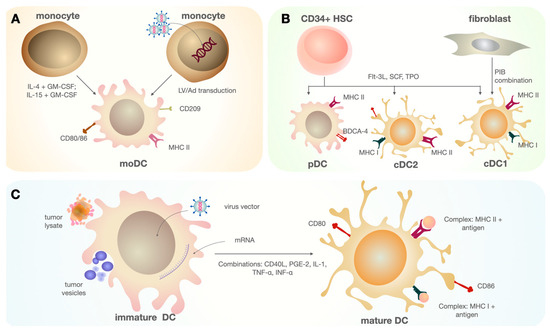 DCs can be created by various methods in vitro. (A) MoDCs are obtained through directed differentiation from CD14+ monocytes using various cytokine combinations, such as IL-4, GM-CSF, IFN-α, IL-15, etc. Resulting cells express several surface markers that are characteristic of moDCs and necessary for antigen presentation [53]. (B) A combination of three main subsets of DCs—cDC1, cDC2, and pDC—can be obtained from HSC CD34+ using FMS-like tyrosine kinase 3 ligand (FLT3L), thrombopoietin (TPO), and stem cell factor (SCF). A population similar in marker composition to cDC1 can be obtained through the direct reprogramming of fibroblasts transduced with the transcription factor set PU.1 + IRF8 + BATF3 (PIB) [54]. (C) The process of antigen internalization and DC activation occurs, where the antigens can be tumor vesicles, inactivated tumor cells, or the lysates of tumor cells. Antigen capture occurs, mainly through receptor-mediated phagocytosis mechanisms (lectin-dependent endocytosis, Toll-like receptor endocytosis, and macropinocytosis). One method involves transduction, where the DNA sequence encodes for antigens. An electroporation procedure is used to internalize mRNA molecules. In addition to antigen processing in complex with MHC molecules, a combination of activating molecules serves as a stimulus for maturation under in vitro conditions. The activated (mature) state of DCs is characterized by changes in the expression of costimulatory molecules (CD80, CD86) and integrin and chemokine receptors (CCR7), as well as the suppression of adhesion molecule expression.