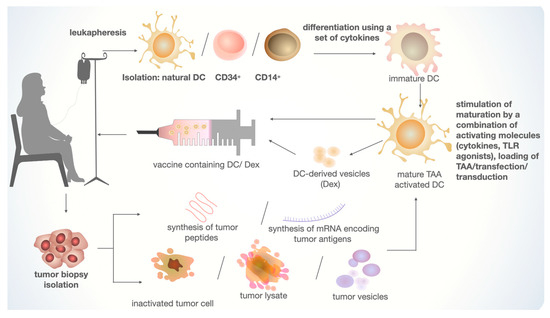 The main stages of creating a personalized DC-based vaccine for cancer treatment. Natural DCs, CD14+ monocytes, or CD34+ are isolated from leukapheresis material. CD14+ and CD34+ cells are differentiated into immature DCs. For TAA, tumor material is isolated, which can be used to construct the necessary antigen. Mature DCs are obtained using a combination of activating molecules and loading TAA. The ready-made injection consists of mature TAA-activated DCs or vesicles obtained from activated DCs (Dex).