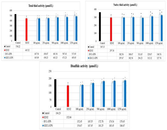 The results of this experiment are given in Figure 1. The total thiol activity, native thiol activity, and disulfide activity were significantly lower in the H2O2 group (445.32 µmol/L; 297.34 µmol/L; 152.04 µmol/L, respectively) compared with the controls (530.22 µmol/L; 365.13 µmol/L; 194.23 µmol/L, respectively) (p < 0.05). In a concentration-dependent manner, the L-EPS groups (445.89–517.65 µmol/L; 297.67–348.76 µmol/L; 152.45–186.67 µmol/L, respectively) showed significantly higher total thiol activity, native thiol activity, and disulfide activity than did the H2O2 group (445.32 µmol/L; 297.34 µmol/L; 152.04 µmol/L, respectively) (p < 0.05). The efficacies of the L-EPS concentrations in descending order were 1250 µg/mL > 1000 µg/mL > 500 µg/mL > 250 µg/mL > 100 µg/mL. The strain-based order of action of the L-EPSs on disulfide activity was GD2 > B3; on the other hand, the strain-based order of action of the L-EPSs on total thiol activity and native thiol activity was B3 > GD2.