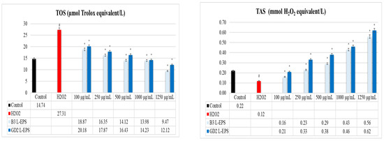 The results of this experiment are given in Figure 2. The H2O2 group (27.31 µmol Trolox equivalent/L; 0.12 mmol H2O2 equivalent/L, respectively) showed a significantly higher TOS level and a significantly lower TAS level than those found in the controls (14.74 µmol Trolox equivalent/L; 0.22 mmol H2O2 equivalent/L, respectively). However, the L-EPSs groups (9.47–20.18 µmol Trolox equivalent/L) led to a significant reduction in TOS level in the H2O2 group (27.31 µmol Trolox equivalent/L) in a concentration-based manner (p < 0.05). Based on their concentration, the L-EPS groups (0.16–0.62 mmol H2O2 equivalent/L) caused a significant increment in TAS levels compared with the H2O2 group (0.12 mmol H2O2 equivalent/L) (p < 0.05). The efficacies of the L-EPS concentrations in descending order were 1250 µg/mL > 1000 µg/mL > 500 µg/mL > 250 µg/mL > 100 µg/mL. The strain-based efficacy of the L-EPSs was B3 > GD2 for TOS and GD2 > B3 for TAS.