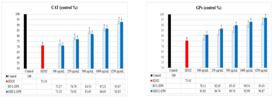 The results of the experiment are given in Figure 3. PON1, SOD, CAT, and GPx antioxidant enzyme levels were found to be significantly lower in the H2O2 group (70.67%; 80.87%; 71.34%; 75.45%, respectively) compared with the control group (100%; 100%; 100%; 100%, respectively) (p < 0.05). On the contrary, the PON1, SOD, CAT, and GPx antioxidant enzyme levels were considerably increased by the L-EPS groups (82.59–93.15%; 81.12–94.58%; 71.13–93.87%; 78.11–96.87%, respectively) in a concentration-based manner as compared with the levels in the H2O2 group (70.67%; 80.87%; 71.34%; 75.45%, respectively) (p < 0.05). The efficacy of the L-EPSs concentrations in descending order was 1250 µg/mL > 1000 µg/mL > 500 µg/mL > 250 g/mL > 100 g/mL. The efficacy of the L-EPSs by strain was as follows: B3 was prominent in SOD and CAT, while GD2 was prominent in PON1 and GPx. The antioxidant enzyme levels affected by the L-EPS groups was, in descending order, SOD > CAT > GPx > PON1.