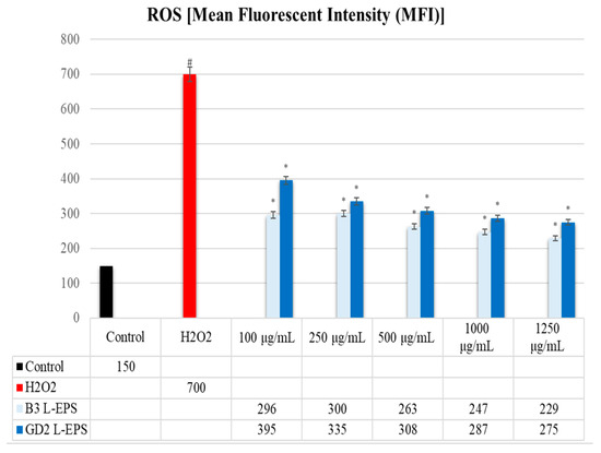 The results are of the experiment are given in Figure 4. The intracellular ROS level was found to be significantly higher in the H2O2 group (700 MFI) compared with the control group (150 MFI) (p < 0.05). In contrast, the intracellular ROS level was considerably decreased by the L-EPS groups (229–395 MFI) in a concentration-based manner as compared with the levels in the H2O2 group (700 MFI) (p < 0.05). The efficacy of the L-EPSs concentrations, in descending order, were 1250 µg/mL > 1000 µg/mL > 500 µg/mL > 250 g/mL > 100 g/mL. The efficacy of the L-EPSs by strain was as follows: B3 > GD2.
