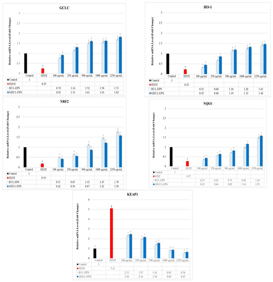 The results of the experiment are given in Table 2. The H2O2 group (30%; 33%; 25%; 36%, respectively) exhibited significantly lower GCLC, HO-1, NRF2, and NQO1 protein expression levels than did the controls (100%; 100%; 100%; 100%, respectively) (p < 0.05). This reduction was significantly increased by the L-EPS groups (33–98%; 34–93%; 34–106%; 36–89%, respectively), based on their concentrations (p < 0.05). The H2O2 group (225%) showed a significantly increased KEAP1 protein expression level than did the control (100%) (p < 0.05). This increase was significantly decreased by the L-EPSs groups (98–220%), based on their concentration (p < 0.05). The effectiveness of the L-EPSs concentrations were in the descending order of 1250 µg/mL > 1000 µg/mL > 500 µg/mL > 250 µg/mL > 100 µg/mL; on the other hand, the effectiveness of the L-EPSs by strain was as follows: B3 L-EPS was prominent in NRF2, and KEAP1, while GD2 L-EPS was prominent in GCLC, HO-1, and NQO1. The protein expression levels affected by the L-EPS groups were in descending order of NRF2 > KEAP1 > GCLC > HO-1 > NQO1. The results we obtained from qRT-PCR are similar to the results we obtained from ELISA.