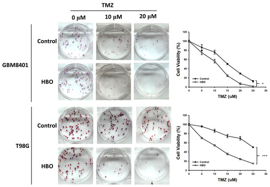 Effect of HBO therapy on TMZ sensitivity of GBM in vitro. To evaluate the therapeutic effect of HBO therapy alone or combined with TMZ, GBM8401 and T98G cells incubated with or without HBO therapy were treated with different doses of TMZ (0, 5, 10, 15, 20, and 25 μM) using 0.5% crystal violet. * p < 0.05 and *** p < 0.001 compared between control group and HBO group. GBM, glioblastoma multiforme; HBO therapy, hyperbaric oxygen therapy; TMZ, temozolomide.
