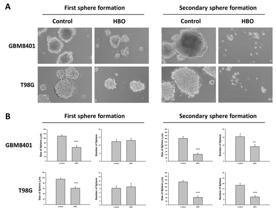 Effect of HBO therapy on GBM stemness in vitro. A neurosphere assay was used to evaluate the effect of HBO therapy on GBM stemness in vitro. The number and size of neurospheres at first and secondary sphere formation were measured in GBM8401 and T98G cells treated or untreated with HBO therapy. (A) Microscopic images of neurospheres in GBM8401 and T98G cells treated or untreated with HBO therapy (magnification ×100); (B) Box plots of the number and size of neurospheres measured with or without HBO therapy in GBM8401 and T98G cells. ** p < 0.01 and *** p < 0.001 compared between control group and HBO group. GBM, glioblastoma multiforme; HBO therapy, hyperbaric oxygen therapy.
