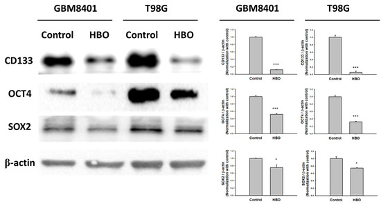 The protein expression of biomarker for GBM stemness in GBM8401 and T98G. The protein expression and relative intensity for CD133, OCT4, and SOX2 determined using Western blot in GBM8401 and T98G cells. * p < 0.05 and *** p < 0.001 compared between control group and HBO group.