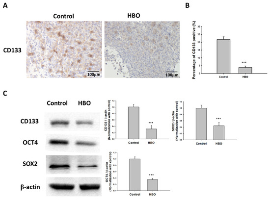 In vivo, the results demonstrated significant differences between the control and HBO therapy groups in terms of CD133 expression (Figure 6A). Immunohistochemical staining for CD133 (Figure 6A) showed a notable decrease in CD133-positive cells in the HBO therapy group compared to the control group. This decrease in CD133-positive cells was quantified (Figure 6B), confirming a significantly lower proportion of CD133-positive cells in the HBO group. To gain further insights into the molecular changes associated with these findings, we conducted Western blot analysis (Figure 6C). This analysis encompassed the evaluation of the protein levels of CD133, OCT4, and SOX2. Remarkably, the Western blot results revealed that the HBO therapy group exhibited markedly reduced protein expression levels of CD133, OCT4, and SOX2 when compared to the control group. These combined observations strongly support the notion that HBO therapy has the potential to inhibit the formation and maintenance of cancer stem cells (CSCs) in vivo.