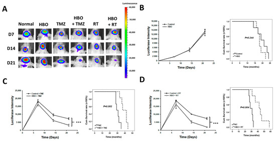 Sixty immunodeficient and NU/NU nude mice were obtained from the LASCO Laboratory Animal Center (Taipei, Taiwan). All mice were housed at a constant temperature (24 °C) and under regular light/dark cycles between 6:00 am and 6:00 pm, with free access to a standard diet. GBM8401 cells with luciferase (1 × 105 cells in a volume of 5 μL) were injected intracranially into the striata of immunodeficient mice. GBM8401 cells (1 × 105 cells in a volume of 5 μL) were injected intracranially into the striata of NU/NU nude mice. For HBO therapy, mice were placed in an atmosphere of 100% oxygen at 1.5 atm for 1.5 h every day on days 1–21 after tumor cell injection. For chemotherapy, mice were injected intraperitoneally with 10 mg/kg of TMZ every day on days 7–21 after tumor cell injection. For radiotherapy, mice were treated with 2 Gy of radiation three times per week on days 7–21 after tumor cell injection. The protocol of the animal study was approved by the Committee of Institutional Animal Research of Kaohsiung Medical University (IACUC 111223). To assess the effect of HBO therapy in vivo, we evaluated the tumor sizes using in vivo bioluminescence imaging via the Xenogen IVISR Spectrum Noninvasive Quantitative Molecular Imaging System (J&H, Hongkong, China; IVIS Lumina LT 2D) at 7, 14, and 21 days after injection with GBM cells and compared them among the mice treated with HBO therapy, TMZ, radiotherapy, and HBO therapy combined with TMZ or radiotherapy.