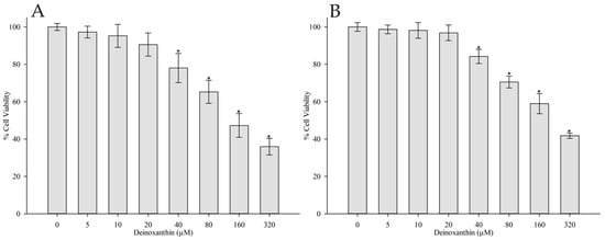 Effects of varying DNX concentrations on the cytotoxicity of human foreskin fibroblast cells (HFF-1) observed at (A) 24 h and (B) 48 h. Values are represented as mean ± standard error of mean. * p < 0.05 vs. 0 µM DNX groups.