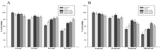 The research conducted experiments on groups exposed to specified concentrations of DNX and VitC (200 µM), established from cytotoxicity test outcomes. In the present investigation, VitC was incorporated as it is a water-soluble micronutrient commonly employed as a benchmark in research focusing on the attenuation of ultraviolet-induced cellular damage [,,,,]. In addition, a negative control group (non-irradiated) and a positive control group (exposed to UVA doses of 8, 16, and 24 J/cm2 and UVB doses of 35, 70, and 100 mJ/cm2) were also included. Initially, 100 µL of growth medium-containing cells (5 × 103) were seeded in 96-well plates, followed by a 24 h incubation period. The cells were treated with either various concentrations of DNX (0, 5, 10, and 20 µM) or 200 µM VitC in FBS-free DMEM for 12 h. After discarding the supernatant, each well underwent three washes with 150 µL of DPBS (pH 7.4). Subsequently, 200 µL of DPBS were added to each well, followed by UVA or UVB irradiation using the photoreactor system (LZC-4X, Luzchem, Ottawa, ON, Canada) consisting of UVA lamps (2.25 mW/cm2) and UVB lamps (0.8 mW/cm2). The lamp’s intensity was gauged utilizing an HD 2302.0 radiometer (Delta OHM, Padova, Italy) equipped with both UVA and UVB sensors. Post irradiation, the DPBS was discarded and replaced with 100 µL of DMEM without FBS, which was then incubated for 12 h. Subsequently, cell viability was determined via the MTT assay, as outlined earlier in the cytotoxicity test.