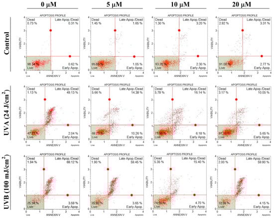 To evaluate the anti-apoptotic efficacy, the maximal selected doses of UVA and UVB (24 J/cm2 and 100 mJ/cm2, respectively) were employed. This approach aimed to ascertain the uppermost protective capacity of DNX within the chosen concentration spectrum. In this study, the protective efficacy of DNX against UVA and UVB-induced apoptosis in HFF-1 cells was assessed using the Annexin V-FITC/PI double-staining assay. Cells were treated with varying DNX concentrations, exposed to specified UVA and UVB intensities, and subsequent apoptotic effects were quantified post-irradiation using the Muse® Annexin V & Dead Cell Kit (Figure 3).