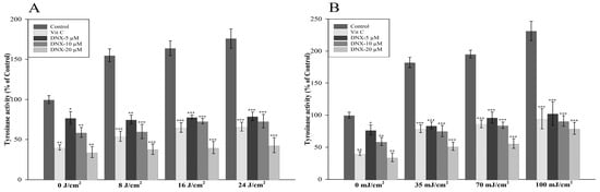 Activity of tyrosinase in HFF-1 cells exposed to UVA (A) and UVB (B) radiation was determined after treatment with varying concentrations of DNX. Statistical significance in this figure indicates the observed differences between the control group and the groups treated with varying concentrations of DNX and VitC, all subjected to the same UV dosage levels. The mean percentages ± s.e.m. are shown (n = 6). * p < 0.05; ** p < 0.001; *** p < 0.005.