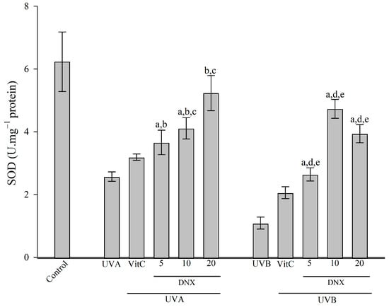 Activity of SOD in HFF-1 cell after UVA and UVB irradiation with different concentrations of DNX and VitC. Values are represented as mean ± standard error of mean. a p < 0.05 vs. control group. b p < 0.05 vs. UVA group. c p < 0.05 VitC-treated + UVA group. d p < 0.05 UVB group. e p < 0.05 VitC-treated + UVB group.