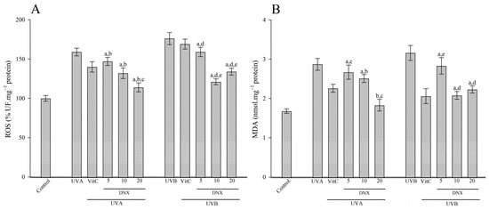 Exposure of HFF-1 cells to UVA radiation increased both the ROS (159 ± 4.9%) and MDA (2.87 ± 0.15 nmol/mg protein) content in comparison to control cells (ROS: 100 ± 3.6%; MDA:1.68 ± 0.06 nmol/mg protein, respectively). On the other hand, HFF-1 cells treated with VitC resulted in a reduction in both ROS (140 ± 6.7%) and MDA (2.26 ± 0.10 nmol/mg protein) content compared to those only exposed to UVA. Interestingly, 20 µM DNX was found to inhibit the elevation in ROS (114 ± 5.7%) and MDA (1.83 ± 0.15 nmol/mg protein) concentration caused by UVA (Figure 6).