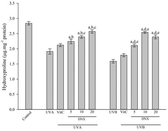 Hydroxyproline formation in HFF-1 cell after UVA and UVB irradiation with varying concentrations of DNX and VitC. Values are represented as mean ± standard error of mean. a p < 0.05 vs. control group. b p < 0.05 vs. UVA group. c p < 0.05 VitC-treated + UVA group. d p < 0.05 UVB group. e p < 0.05 VitC-treated + UVB group.