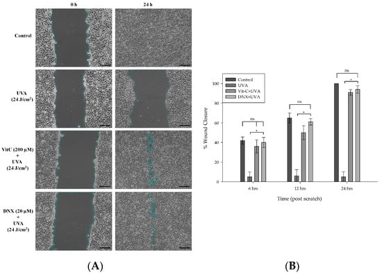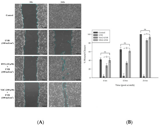 Effect of DNX on scratch wound healing in UVB-irradiated HFF-1 cells. (A) DNX rescues the UVB-induced wound-healing defect. Confluent cells were mechanically scratched with a pipette tip and pretreated with DNX and VitC prior to UVB irradiation. Invert micrographs (40× magnifications, 400 µm scale bar) of scratched HFF-1 cells were taken at 0 and 24 h following irradiation. (B) In the wound healing assay, the graph of % wound closure was derived from the assessment of inverted micrographs using Image-Pro Plus 6.0 Software. Data are expressed as the mean ± standard deviation of three independent experiments. ns: non-significance, * p < 0.05.