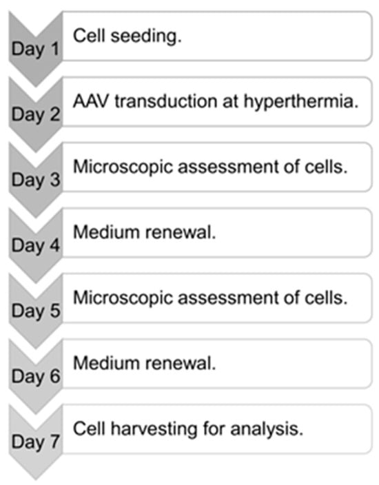 Methodology of melanoma cell transduction with rAAV/DJ vectors under hyperthermia. This experiment lasted seven days; the activities performed on each day are presented in the timeline.
