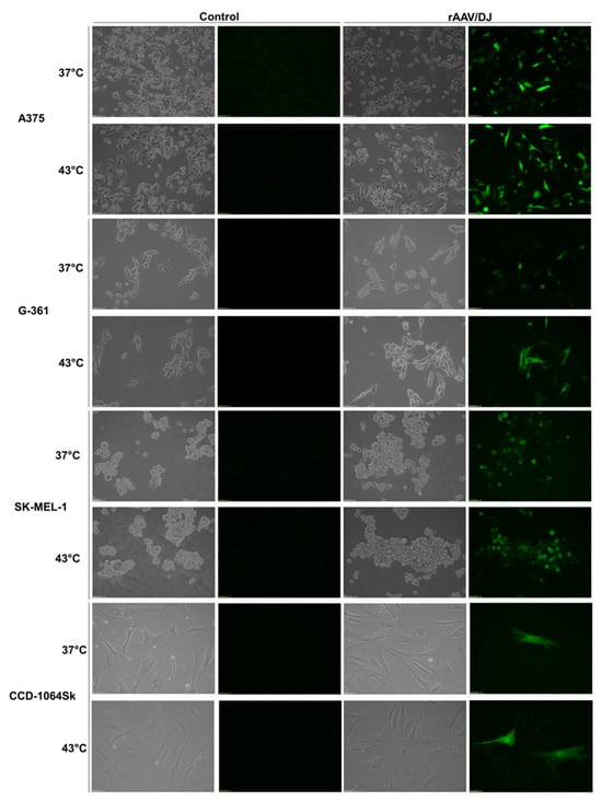 Photographs of the A375, G-361, SK-MEL-1, and CCD-1064Sk cells. These photos show non-transduced cells (control) and transduced cells (rAAV/DJ) under standard conditions (37 °C) and at hyperthermia (43 °C). The photos were taken using a fluorescent microscope in the bright field (BF) and FITC (fluorescein isothiocyanate) filters at a 10× magnification.