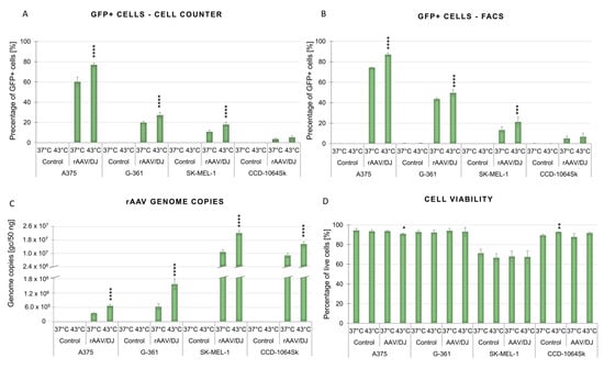 Efficiency of transduction with the rAAV/DJ vector of the A375, G-361, SK-MEL-1, and CCD-1064Sk cells under hyperthermia. The results are shown for non-transduced cells (control) and transduced cells (rAAV/DJ) under standard conditions (37 °C) and underhyperthermia (43 °C). The results are presented as a mean of two independent experiments conducted in three repeats ± SD. The number of GFP+ (green fluorescent protein positive) cells was measured with an automatic cell counter (A) and a flow cytometer (FACS) (B). (C) The number of rAAV/DJ vector genome copies was measured in the analyzed cells with the qPCR method. Statistically significant differences between 37 °C and 43 °C are marked with asterisks (*** p < 0.001; **** p < 0.0001). (D) Cell viability after exposure to the hyperthermia condition. The results are presented as a percentage of live cells. The data were measured with FACS. Statistically significant differences between the number of live cells at 37 °C (control) and values in other conditions are marked with asterisks (* p < 0.05; ** p < 0.01).