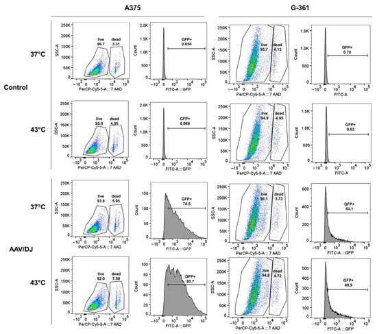 Efficiency of transduction with the rAAV/DJ vector of the melanoma A375 and G-361 cells under hyperthermia. Representative dot plots and histograms present the number of live and dead cells (%) and the number of GFP+ cells (%) for non-transduced cells (control) and transduced cells (rAAV/DJ) under standard conditions (37 °C) and under hyperthermia (43 °C). The percentage of GFP+ cells was measured in the population of live cells.